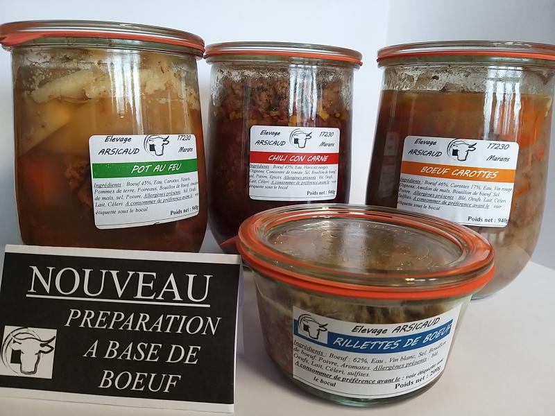 Bocaux de préparation à base de boeuf actuellement disponibles :- Terrine de foie / Rillettes- Bolognaise- Axoa / Chili con Carne / Boeuf Carottes