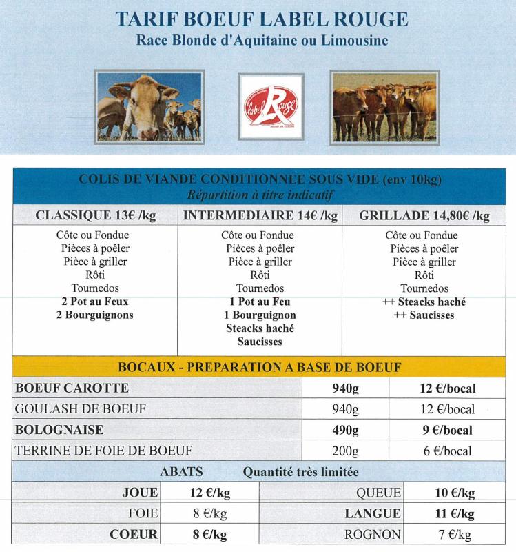La prochaine livraison de colis de boeuf Label Rouge est prévue pour le vendredi 10 décembre 2021. Viande de race Limousine. Les commandes sont à passer avant le 1er décembre. Détails des tarifs colis et bocaux ci-dessous. -5% pour toute commande de 2 colis et plus. |