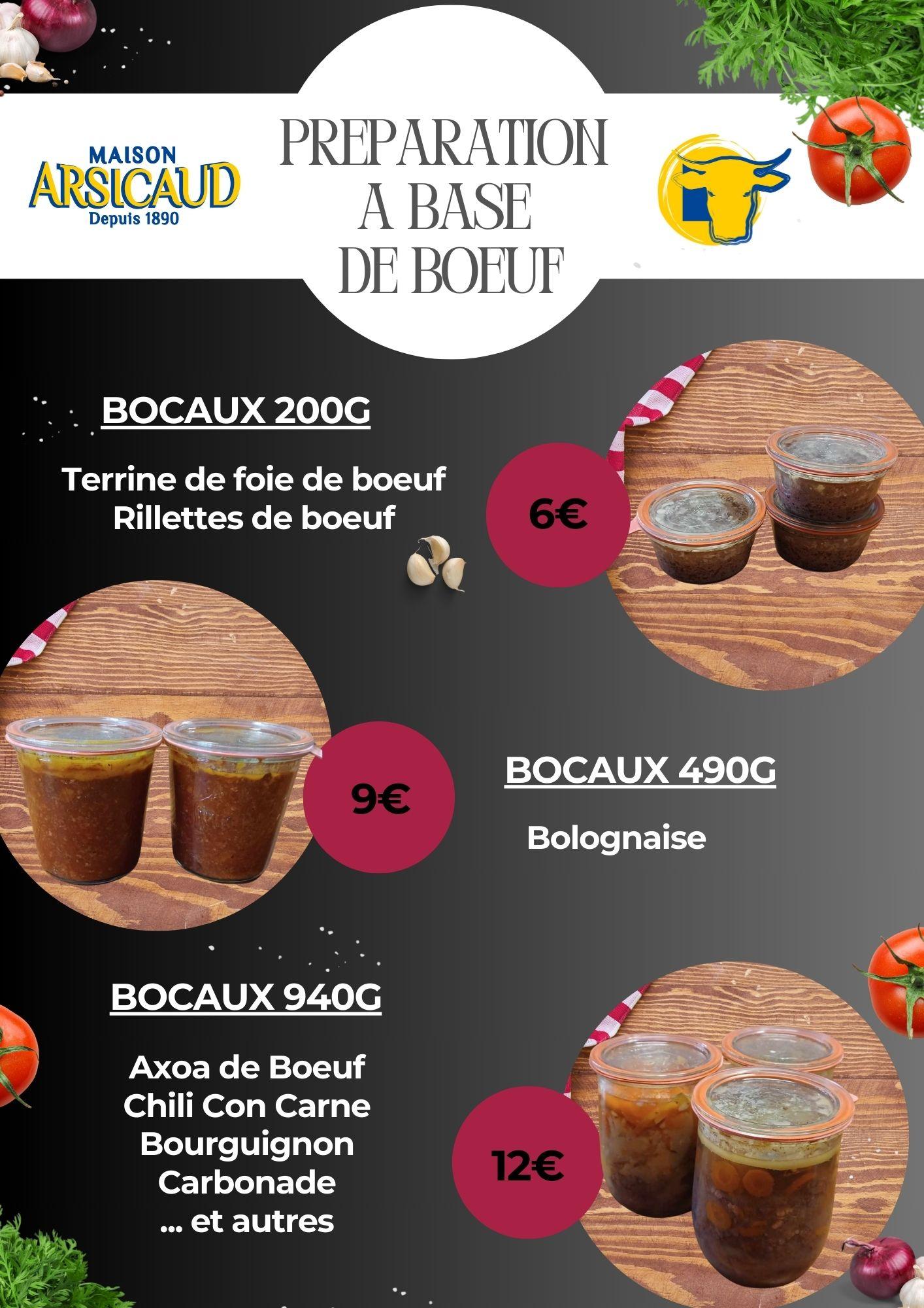 Bocaux de préparation à base de boeuf actuellement disponibles :- Terrine de foie / Rillettes- Bolognaise- Axoa / Chili con Carne / Boeuf Carottes